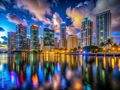 Naklejka premium Vibrant Miami Downtown Nightscape: Illuminated Skyscrapers and City Lights