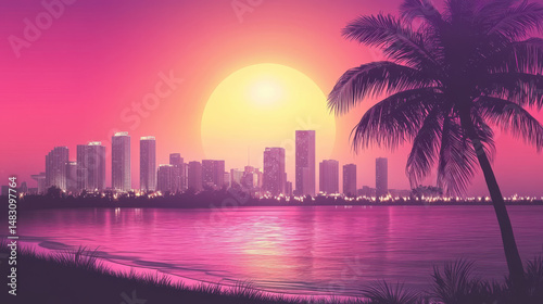 © K'kriang Krai, Obraz premium vibrant Miami skyline at sunset with palm trees and water reflections