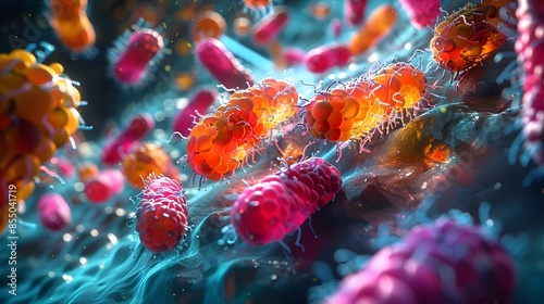 © Bos Amico, Naklejka premium Vibrant Microbial Ecosystem Intricate Patterns of Coexisting Gut and Skin Microbiota