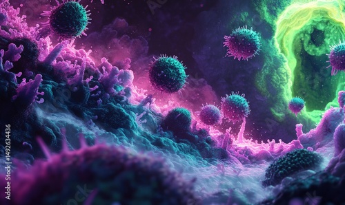 © NENI, Obraz premium Vibrant microscopic view of cells and viruses, with glowing neon colors