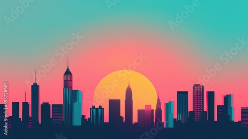 © Moonroad, Naklejka premium Vibrant minimalist city skyline silhouette at sunset with colorful sky gradients. Modern cityscape illustration with urban skyscrapers.