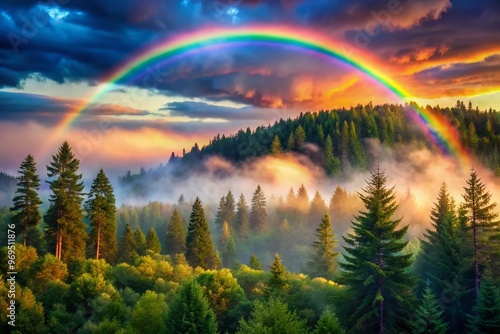 Obraz premium Vibrant, misty rainbow arcs across a serene sky, bridging earthy tones of a lush forest floor and towering