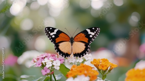 Fototapeta premium Vibrant Monarch Butterfly Perched on Colorful Lantana Flowers in a Lush Garden with Soft Bokeh Background, Capturing Nature Beauty and Delicate Details