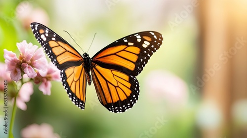 © 669, Fototapeta premium Vibrant Monarch Butterfly Perched on Delicate Flower in Nature