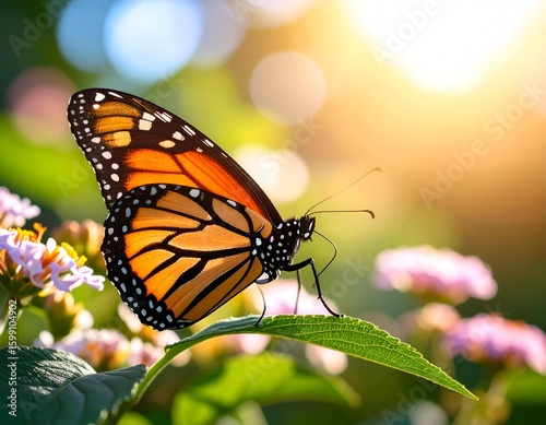 Fototapeta premium Vibrant monarch butterfly resting on a green leaf at sunset, showcasing its...