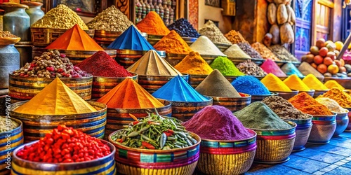 Fototapeta premium Vibrant Moroccan Souk with Colorful Spices, Textiles, and Traditional...
