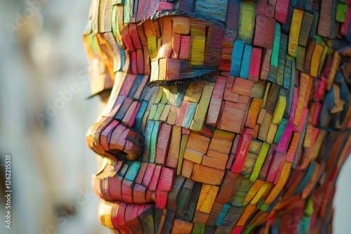 © Aleksandr, Naklejka premium Vibrant mosaic face sculpture with multicolored wooden pieces