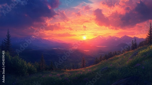 © Yaowarat, Obraz premium Vibrant Mountain Sunset View