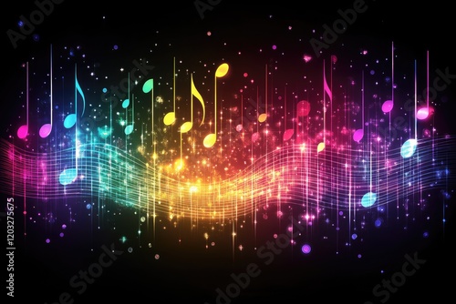Fototapeta premium Vibrant Musical Notes and Rainbow Waves on a Starry Black Background