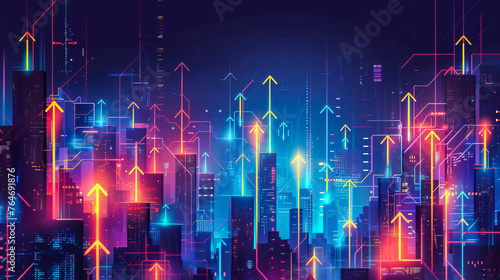 Fototapeta premium Vibrant neon arrows ascend amidst a digital cityscape, symbolizing growth and...