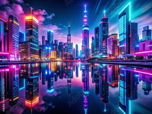 Fototapeta premium Vibrant Neon City Background with Glowing Lights and Reflections for Urban...