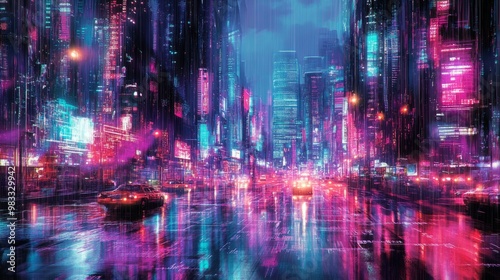 Obraz premium Vibrant Neon Cityscape at Night with Reflections