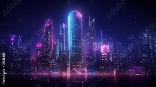 Obraz premium Vibrant Neon Cityscape with Futuristic Skyscrapers and Glowing Lights...