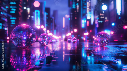 © Sadia, Naklejka premium Vibrant neon cityscape with reflective glass spheres on a wet street at night