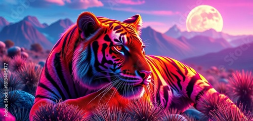 Naklejka premium Vibrant neon-colored tiger with glowing stripes, surreal landscape, dark,...