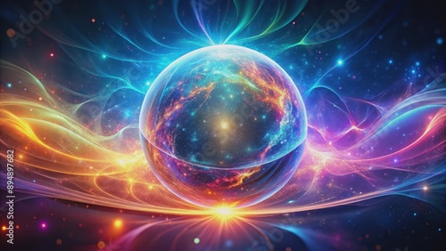 © nittiya, Fototapeta premium Vibrant neon energy sphere surrounded by swirling waves and sparkling particles in a cosmic backdrop, neon, energy, sphere