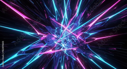 Naklejka premium Vibrant neon explosion of geometric shards and energetic lights.