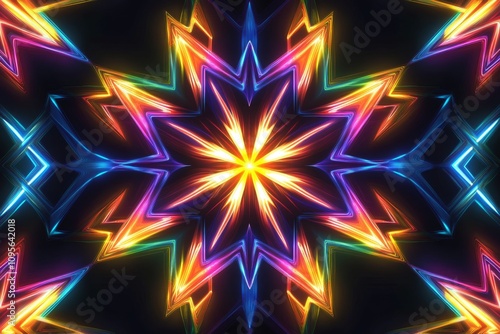 Fototapeta premium Vibrant neon kaleidoscope pattern with radiant star design