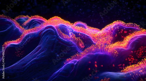 © Kufareesah, Obraz premium Vibrant Neon Landscape Abstract Purple Orange Glowing Microbial Forms
