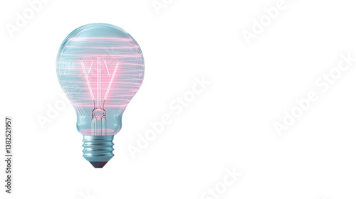 © Chanthakan, Fototapeta premium Vibrant neon light bulb illuminated with a modern abstract geometric design in shades of pink and blue against a plain white background