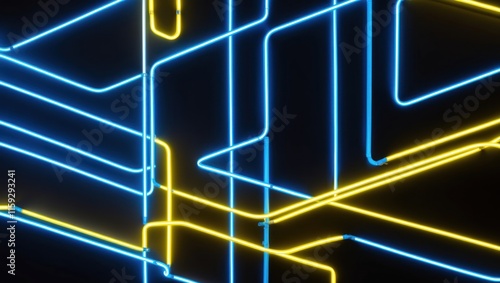 Naklejka premium Vibrant neon light lines in blue and yellow create an abstract, modern background, ideal for technology themed designs or creative projects