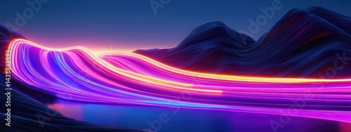 Fototapeta premium Vibrant neon light trails flow across a dark, stylized landscape. The colors...