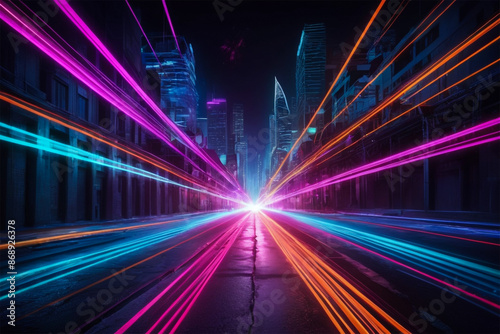 © Bibi Moriam Nayan, Obraz premium Vibrant Neon Light Trails Forming Abstract Patterns Against Dark Urban Setting for New Year's Celebration