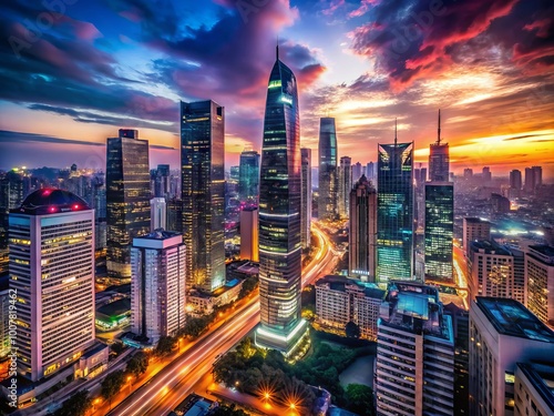 Fototapeta premium Vibrant neon lights illuminate a dark cityscape at dusk, casting a mesmerizing glow on sleek skyscrapers and busy