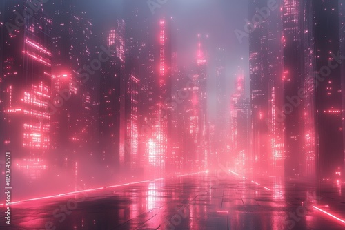Obraz premium Vibrant neon lights illuminate a futuristic cityscape at night amidst fog and atmospheric effects