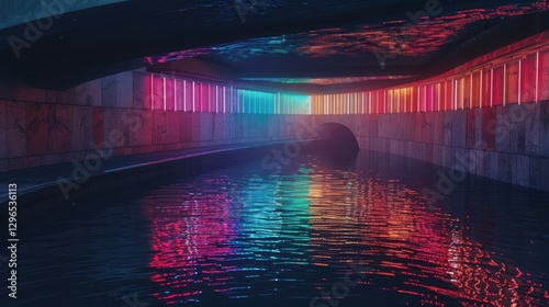 © Natthapong, Obraz premium Vibrant Neon Lights Reflecting on Calm Water in Underground Tunnel
