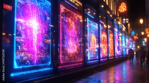 © Premium Illustration, Naklejka premium Vibrant neon lit electronic billboards reflecting on wet city street at night with bokeh lights urban nightlife festive atmosphere modern technology background