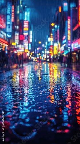 Fototapeta premium Vibrant neon-lit street in a bustling city during rain, reflecting colorful...