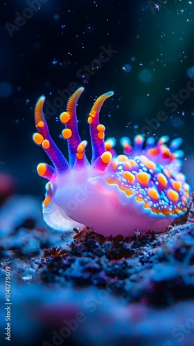 Fototapeta premium Vibrant Neon Nudibranch Crawling Along the Mysterious Ocean Floor