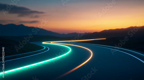 © Atmospheric stock, Naklejka premium Vibrant neon road curves at sunset with mountain silhouette