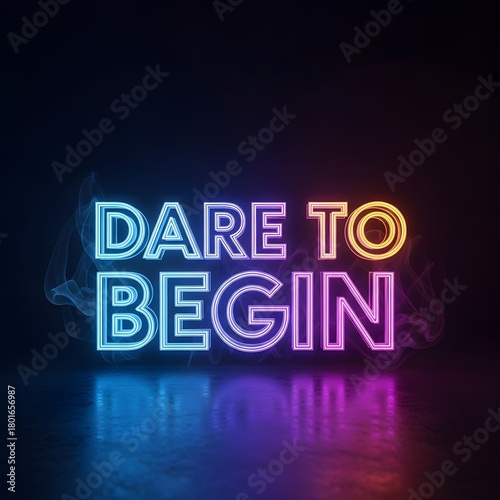 © yutub, Obraz premium Vibrant neon sign displaying the motivational phrase 'Dare to Begin' against a dark background with colorful reflections and smoke effects