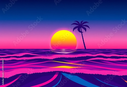 Naklejka premium Vibrant Neon Sunset Ocean Scene Palm Tree Silhouette