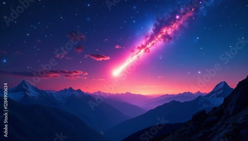 © DITSARAPHAN, Fototapeta premium Vibrant neowise comet illuminating night sky above mountains, comet, stars