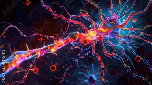 © GOLVR, Obraz premium Vibrant Neural Network Neuron Cell with Glowing Synapse Connections