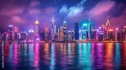 © NawasenaRid, Fototapeta premium Vibrant Night City Skyline with Colorful Reflections