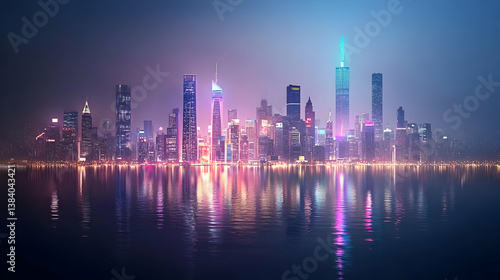 © Parsudi, Fototapeta premium Vibrant Night City Skyline With Reflections