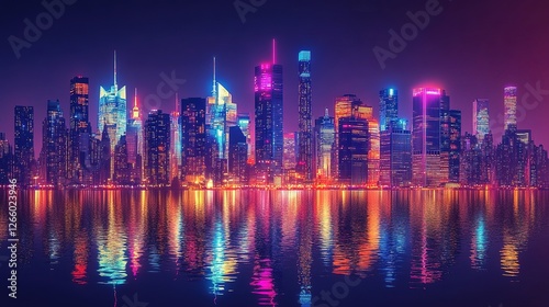 © thanawat, Fototapeta premium Vibrant night cityscape urban skyline digital artwork reflective water aesthetic viewpoint modern concept