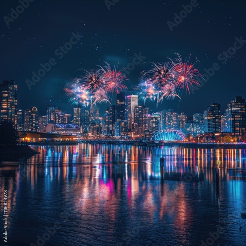 © Gennie Fx, Obraz premium Vibrant Night Cityscape with Fireworks and Water Reflections, Generative AI