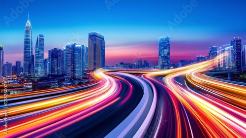 © Sakdecha, Obraz premium Vibrant Night Cityscape with Light Trails and Skyline Views