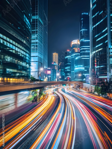 Obraz premium Vibrant Night Cityscape with Motion Blur Light Trails and Skyscraper Skyline...