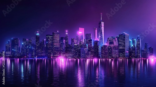 © Kitta Studio, Naklejka premium Vibrant Night Cityscape with Neon Lights Over Reflection on Water