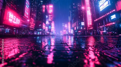 Fototapeta premium Vibrant night in a retro-futuristic city, skyscrapers towering over streets, covered in glowing neon graffiti reflecting off wet pavement, evoking an electric energy