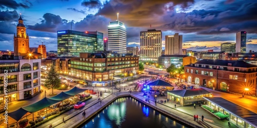 Obraz premium Vibrant night life in the heart of Birmingham, UK with dark black sky overhead, Birmingham, United Kingdom