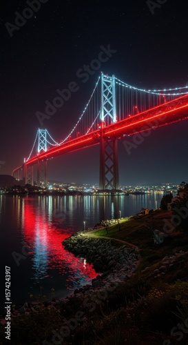 © sutiah-art, Naklejka premium Vibrant Night Lights Illuminating the Ponte Vasco da Gama Bridge in Lisbon, Portugal