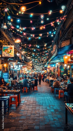 Naklejka premium Vibrant night market scene filled with people and colorful string lights.