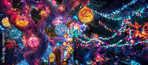Fototapeta premium Vibrant night scene of a beautifully decorated tree adorned with colorful lights and ornaments creating a magical atmosphere
